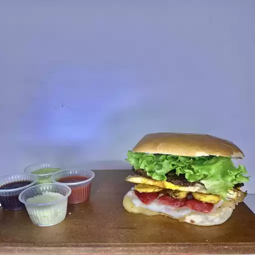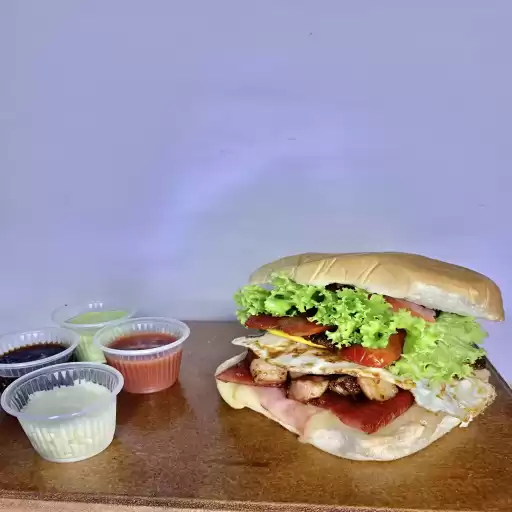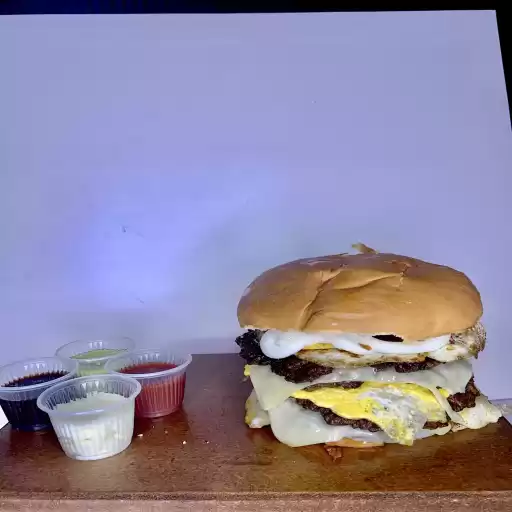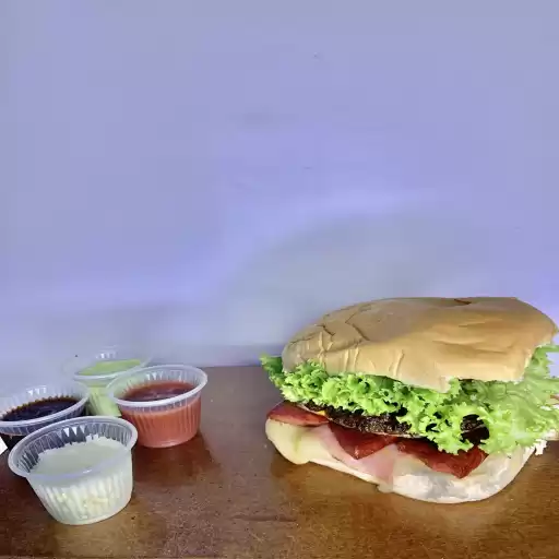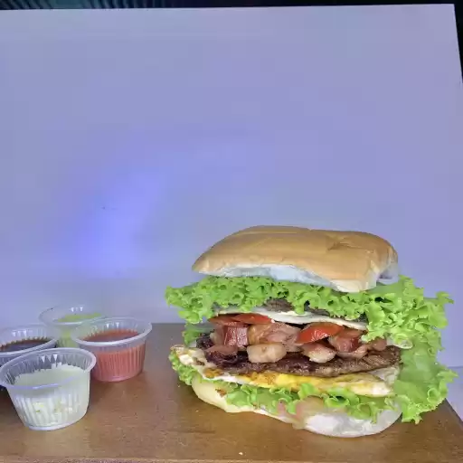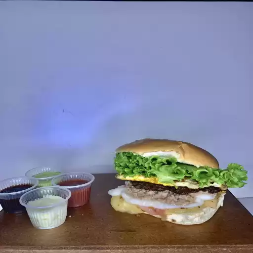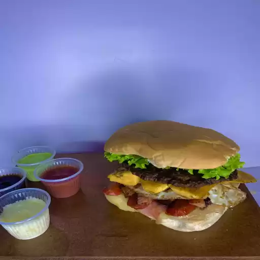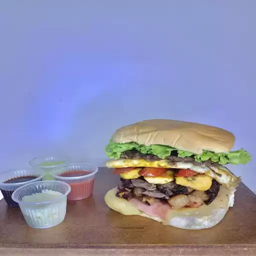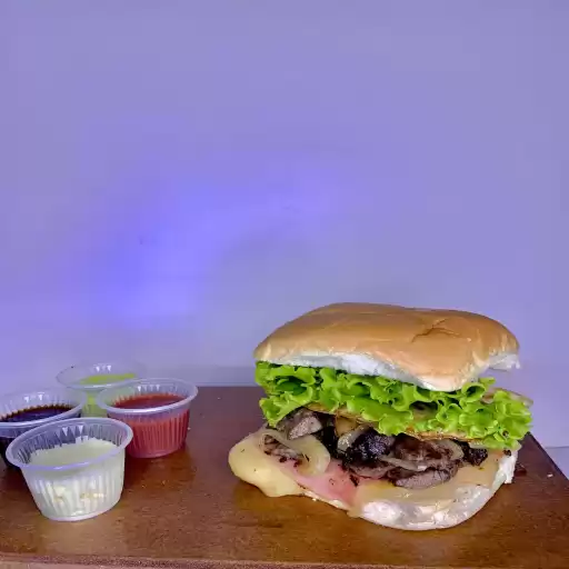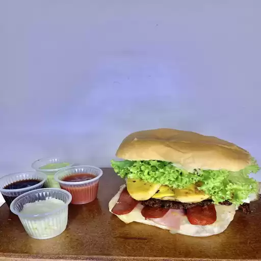 2 hambúrgueres, 2 ovos, queijo, presunto,