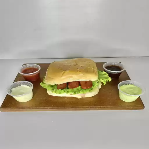 salsicha, queijo, presunto, catupiry, alface e batata palha.