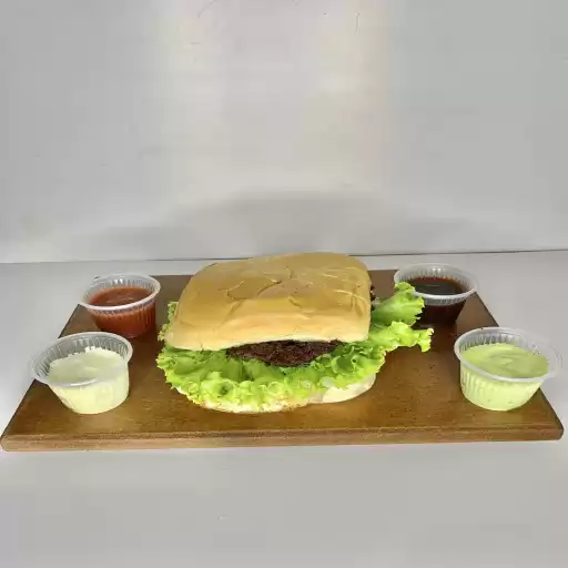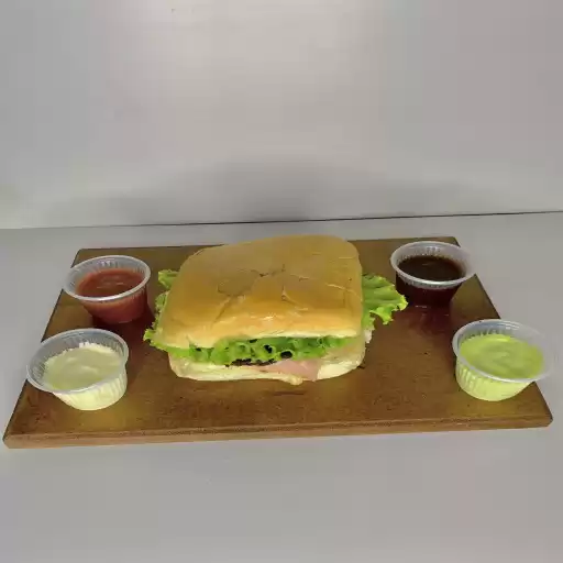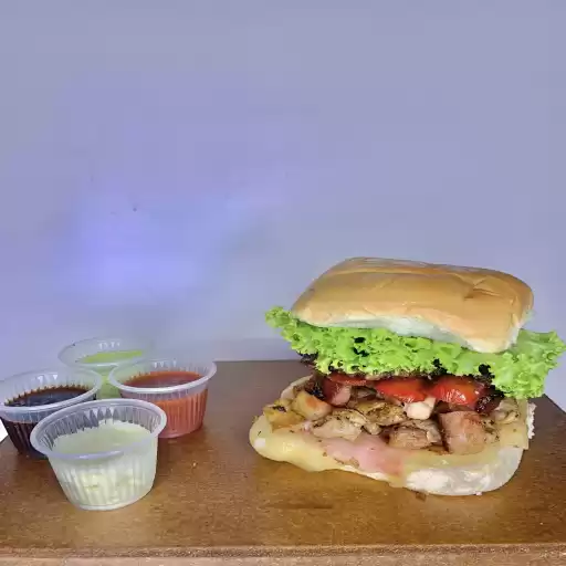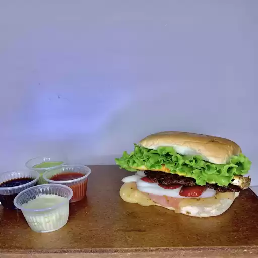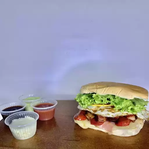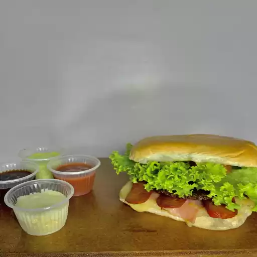 Hambúrguer, ovo, presunto, queijo, alface