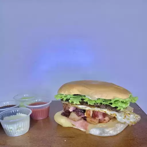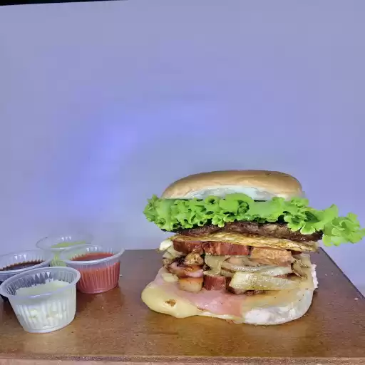 Hambúrguer, bacon, ovo, queijo, presunto, alface e batata palha.