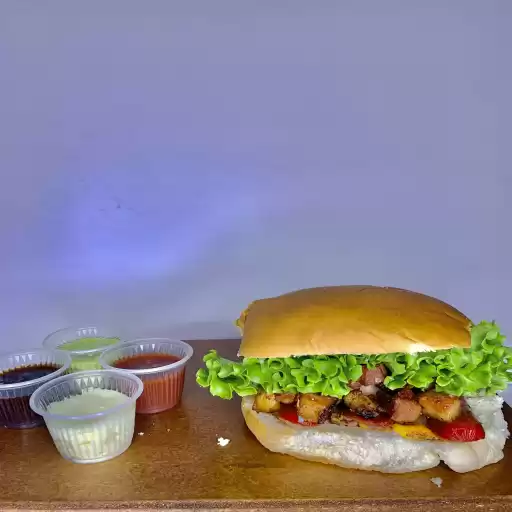 Hambúrguer, frango, bacon, salsicha, ovo,