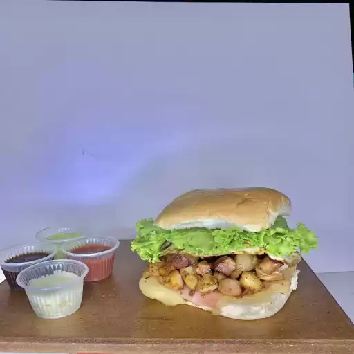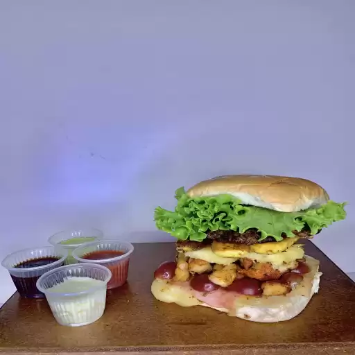 Hambúrguer, ovo, presunto, queijo, alface, banana, cheddar, catupiry e batata palha